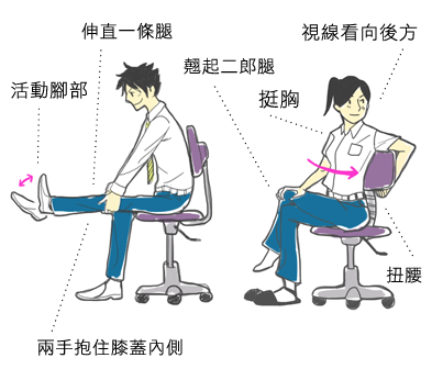 1. 坐在椅子上,單腳抬起並伸直,維持這個姿勢20秒(可用雙手抱住膝蓋)。20秒後再換邊做一次,重複15次。