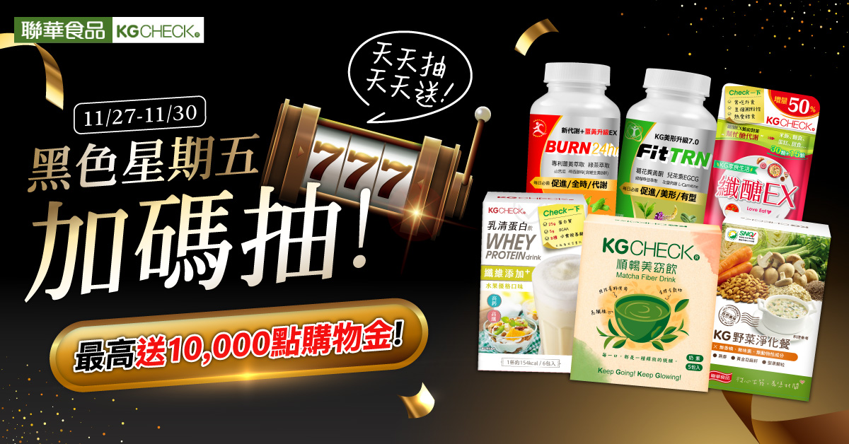 ★黑色星期五拉霸機★11/27(四)-11/30(日) 送加碼金!最高拿10,000點購物金! | KGCHECK聯華食品生醫研究室