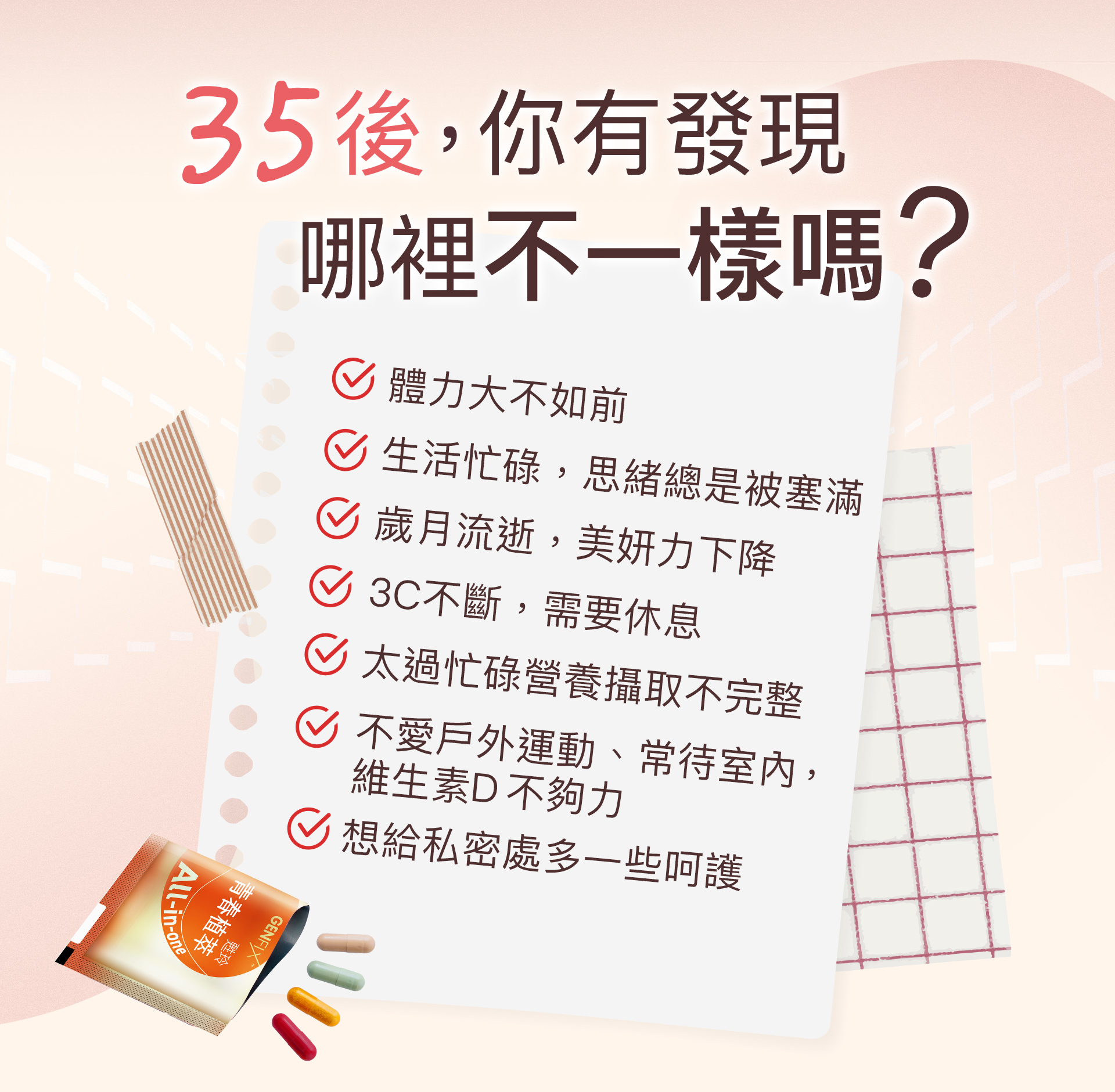 維生素D稱為「陽光營養素」是人體不可缺乏的脂溶性營養素,可透過曬太陽或補充特定食物自行合成,但有90%國人缺乏維生素D,尤其現代女性長期防曬、久坐辦公室,本產品選用歐洲酵母維生素D,高生物利用率、增進鈣吸收;本產品選用美國柑橘複方維生素C,相當於4顆檸檬榨汁,具抗氧化作用、促進膠原蛋白形成,由內而外打造女性自信美麗。