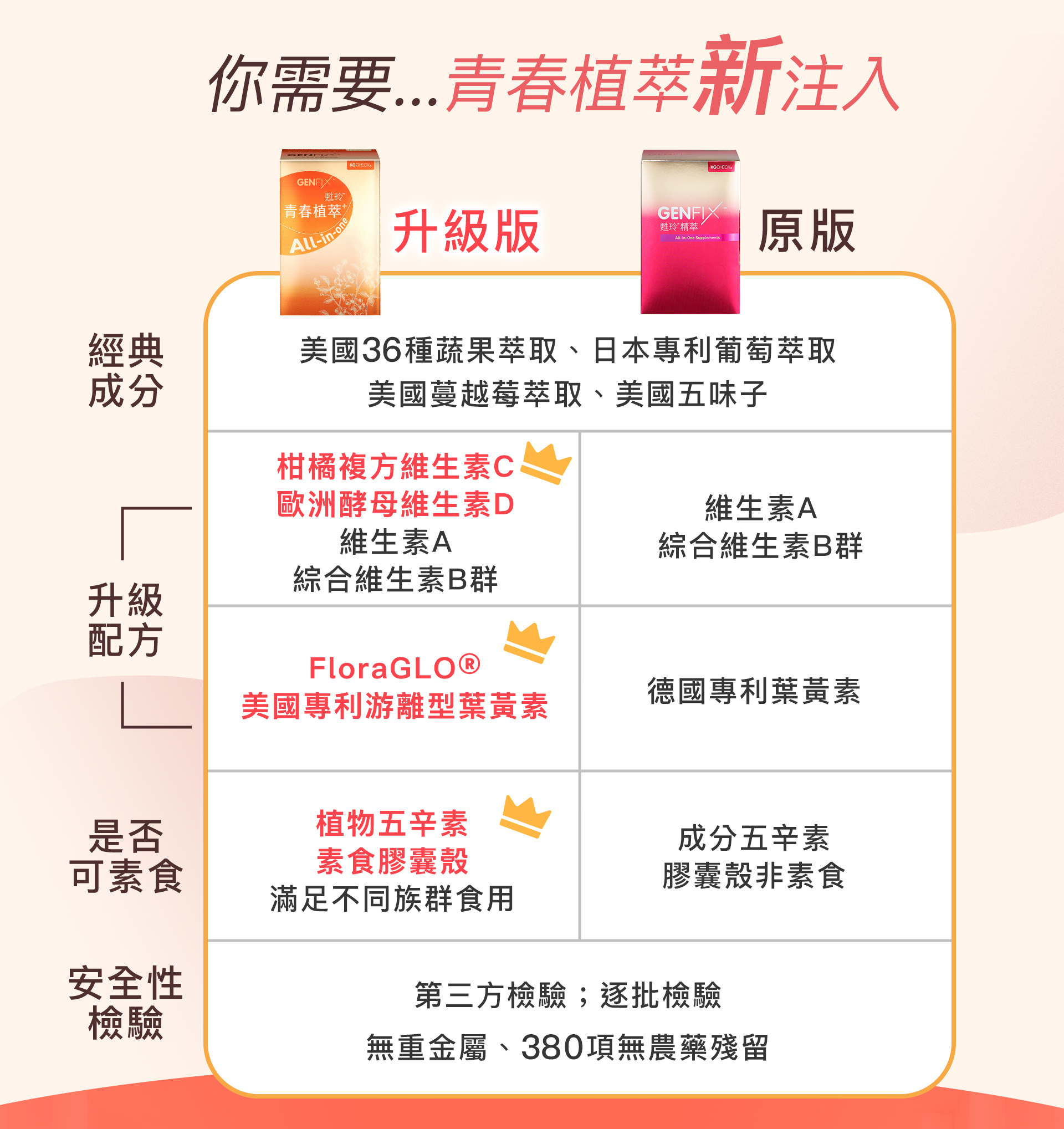 我們使用具22項專利的葡萄籽萃取配方!本產品含有1公斤葡萄的籽、葡萄皮所含的多酚營養,讓豐富前花青素OPC幫您提升青春活力、養顏美容,幫助年過三四十歲的您調整體質、調理好氣色。
