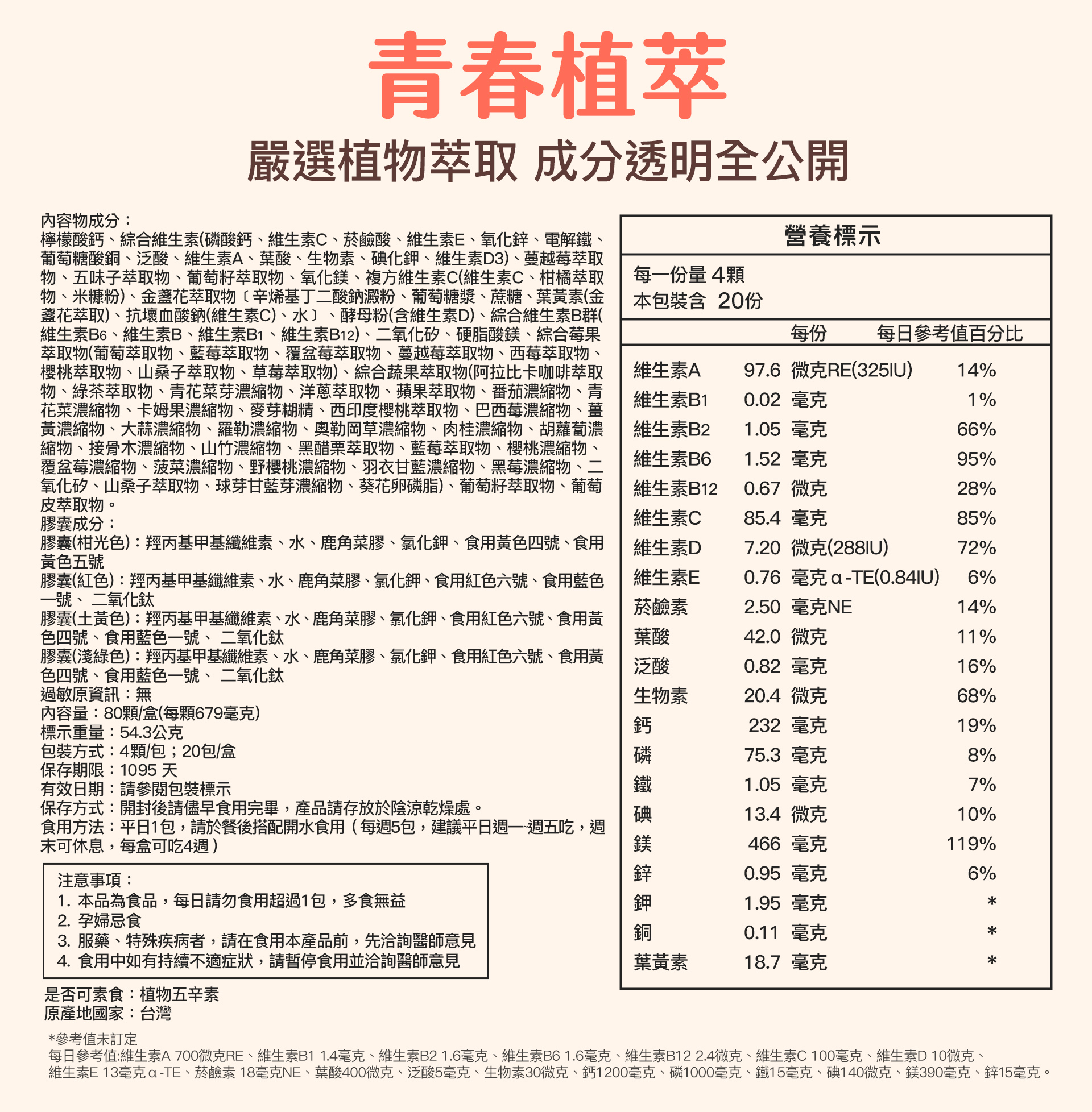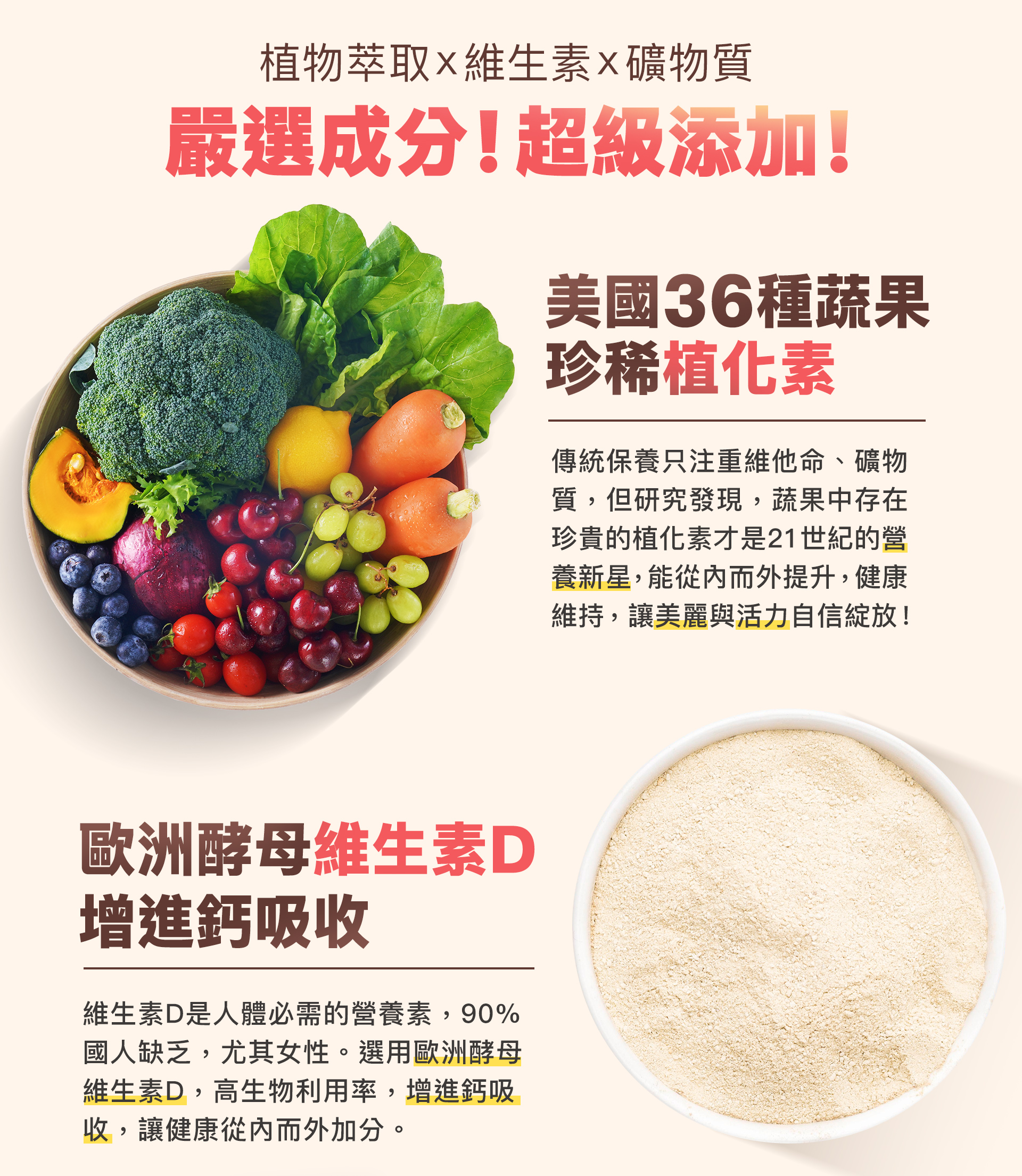 本產品含36種蔬果精華養分,及鈣鎂鐵等礦物質,可補充現代人所需養分。本產品的鈣質含量相當於2杯牛奶的鈣質。且鈣鎂的比例為「2:1」黃金比例,可強化營養的吸收!